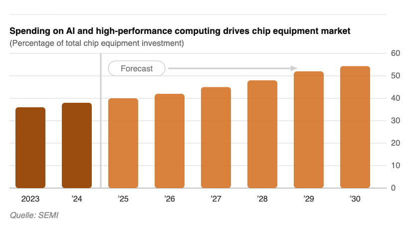 🔧 Chips go trillion. Industry leaders agreed that AI is the main driver pushing semiconductors toward a US$1 trillion market by 2030. Already, 39% of chipmaking equipment spending was AI-related in 2024, a figure expected to hit 55% by 2030. From cars (chip value per vehicle jumping from $922 in 2024 to $1,401 by 2030) to advanced packaging like CoWoS wafers that cost more than a car itself, AI is reshaping demand across the supply chain.